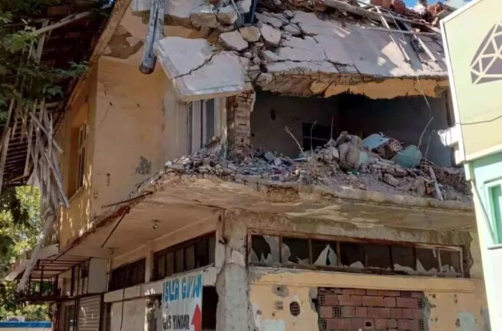 Adıyaman'ın Gölbaşı ilçesinde zelzele sonrası ağır hasar alan bir bina, yıkılma riski nedeniyle etraftaki...